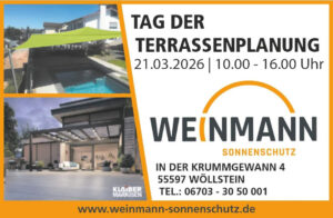 Sie suchen einen erfahrenen Anbieter erprobter Sonnen- und Wetterschutzsysteme, die halten, was sie versprechen? An unserem Hauptsitz im rheinland-pfälzischen Wöllstein bei Bad Kreuznach handeln wir mit individuellen Produkten rund um das Thema Sonnenschutz. Ob Mainz oder Bingen am Rhein – die Sonnensegel, Terrassendächer und Markisen von Weinmann bringen meisterliche Qualität nach Rheinhessen. Nicht zuletzt dank unserer starken Familientradition und einer konsequenten fachlichen Weiterentwicklung unserer Mitarbeiter haben wir seit 1998 eine Vielzahl privater und gewerblicher Kunden zufriedengestellt. Wir freuen uns auf Ihre Anfrage!